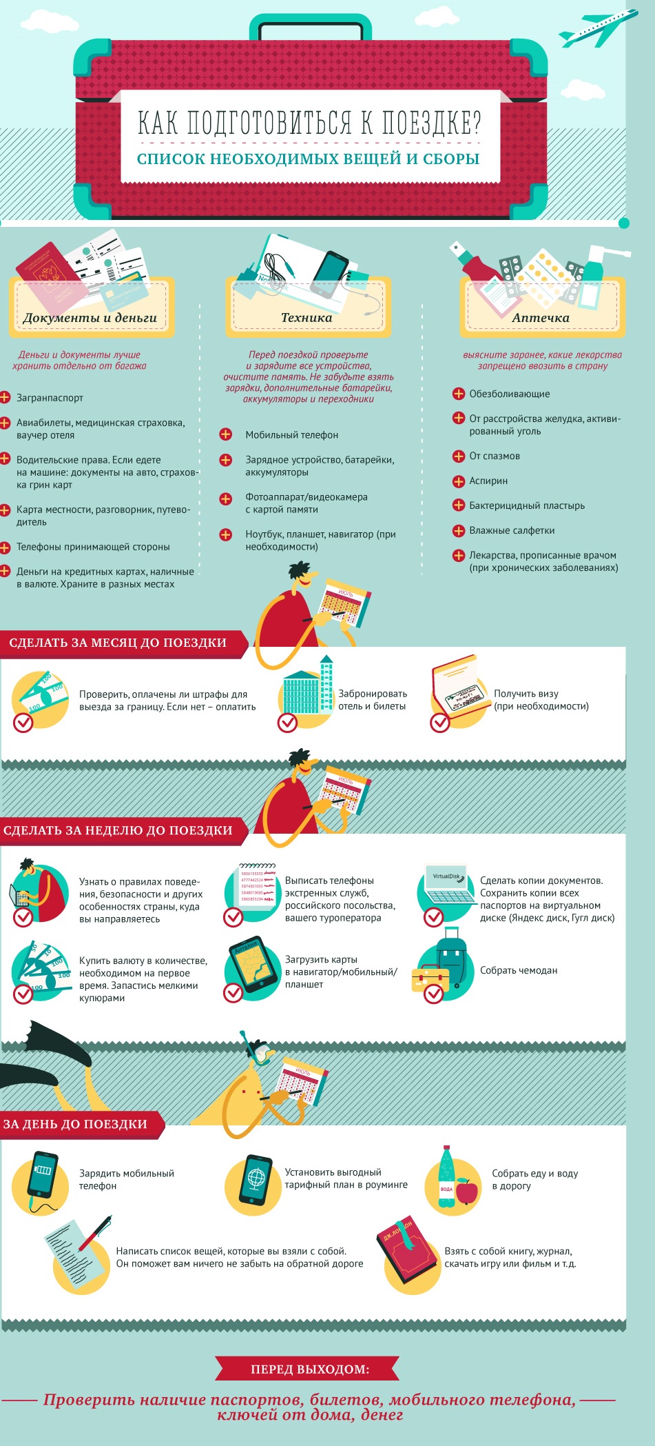 Какие вещи нужно обязательно взять с собой в поездку и что нужно сделать за месяц, неделю и день до отпуска — смотрите на картинке ниже