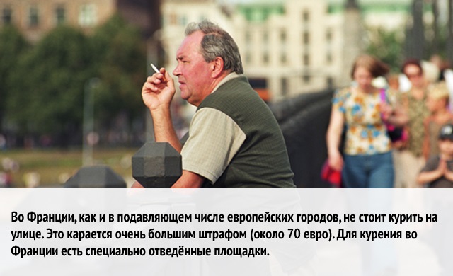 Во Франции, как и в подавляющем количестве европейских городов, никогда не стоит курить на улице. Это карается штрафом.