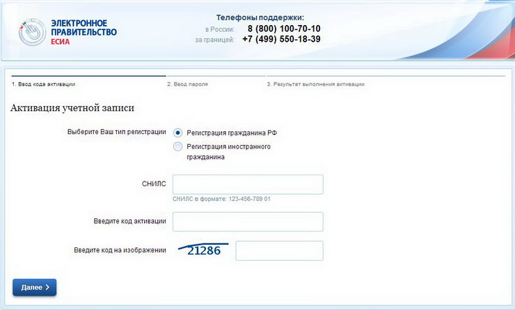 - Выбираем тип регистрации, вводим СНИЛС, код активации и проверочный код с изображения (рис. ниже)